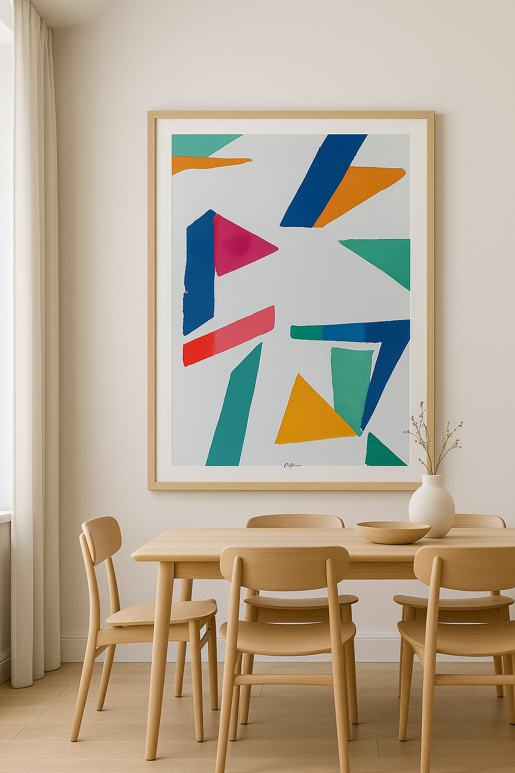 To nowoczesna abstrakcja, która zachwyca prostotą formy i energią barw. Geometryczne kształty w intensywnych odcieniach niebieskiego, zielonego, pomarańczowego i czerwieni tworzą dynamiczną kompozycję, która ożywi każde wnętrze. Minimalistyczne tło podkreśla kontrast kolorów, dzięki czemu dzieło idealnie sprawdzi się zarówno w nowoczesnym salonie, jadalni, jak i biurze.