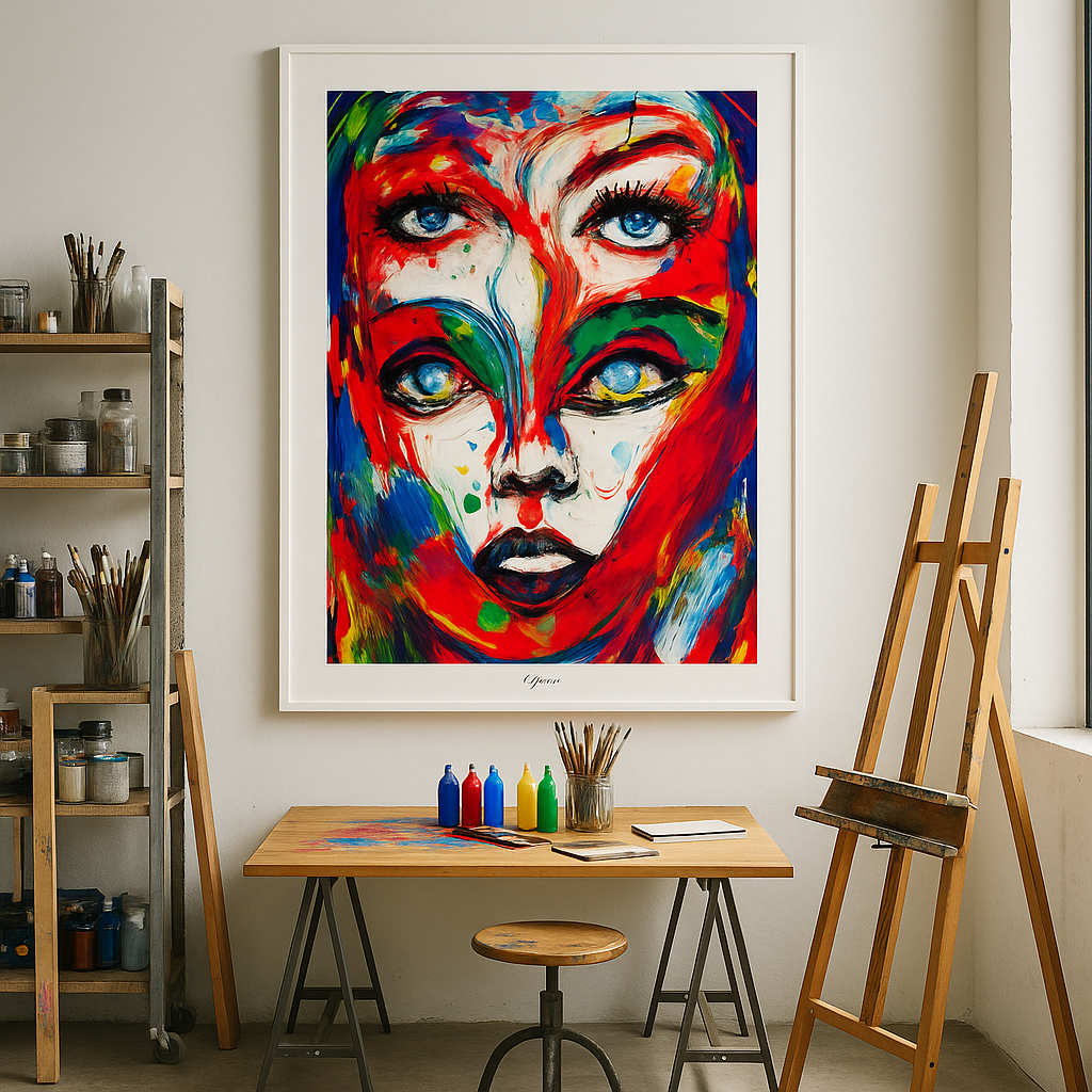 Ten obraz intryguje i przyciąga spojrzenia od pierwszej chwili. Intensywne czerwienie, zielenie, błękity i żółcie splatają się w ekspresyjnej kompozycji, tworząc surrealistyczny portret. Oczy – spojrzenie duszy, intuicja i ukrytą głębia człowieka. Dynamika barw i linii nadaje całości dramatyzmu i sprawiają, że obraz emanuje energią i emocją.