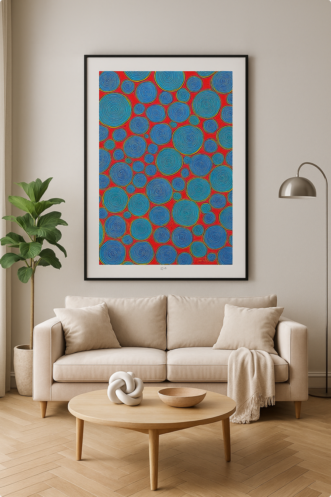Przyciąga wzrok dynamiczną grą barw i kształtów – na intensywnie czerwonym tle wirują setki niebieskich, koncentrycznych kręgów, które zdają się pulsować rytmem własnej energii. Powtarzalność form tworzy efekt hipnozy, a jednocześnie wprowadza harmonię i porządek w tej pozornie chaotycznej kompozycji.
