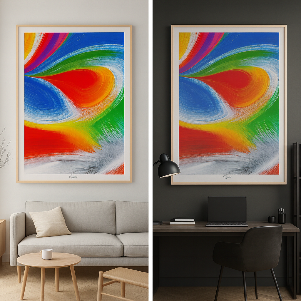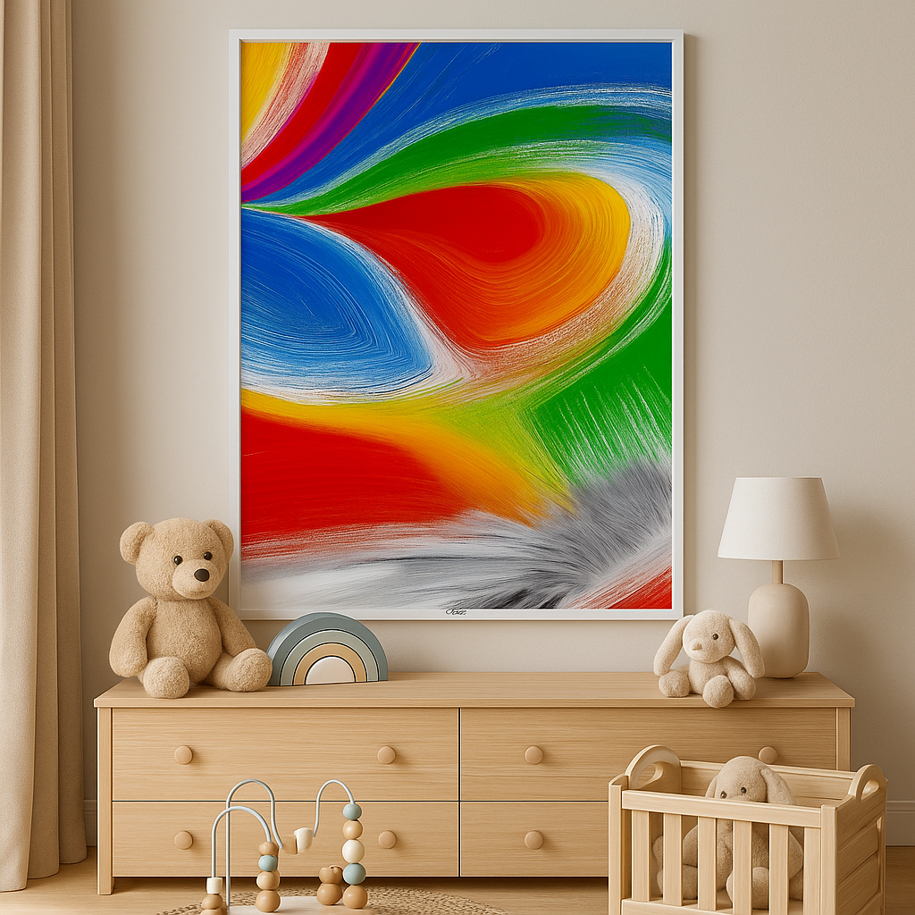 Pełen energii i dynamiki, w którym intensywne barwy wirują niczym w oku kolorowego cyklonu. Żywiołowe czerwienie, głębokie błękity, soczysta zieleń i świetliste żółcie splatają się w hipnotyzującą kompozycję, tworząc wrażenie nieustannego ruchu.